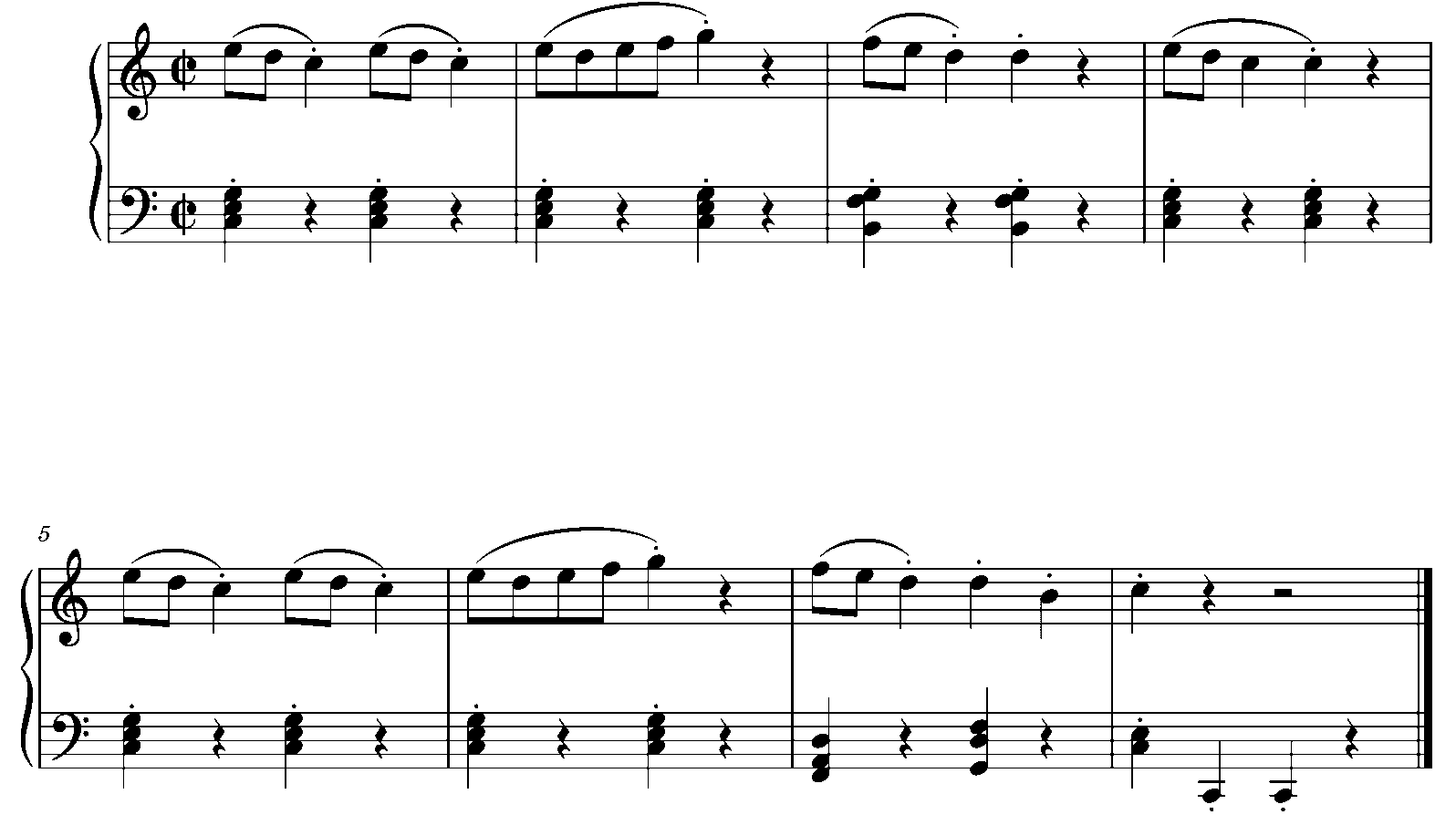伴奏形はシンプル。2/2拍子にして、マーチ風に。